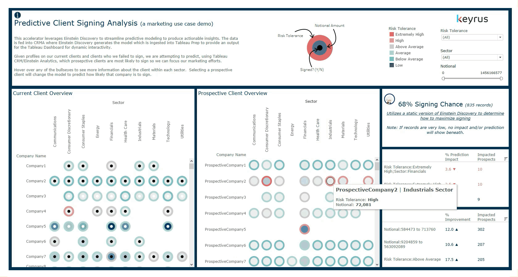 This accelerator leverages Einstein Discovery to streamline predictive modeling to produce actionable insights. The data is fed into CRMA where Einstein Discovery generates the model which is ingested into Tableau Prep to provide an output for the Tableau Dashboard for dynamic interactivity.