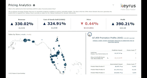 This accelerator leverages Einstein Discovery to streamline predictive modeling to produce actionable insights. The data is fed into CRMA where Einstein Discovery generates the model which is ingested into Tableau Prep to provide an output for the Tableau Dashboard for dynamic interactivity.